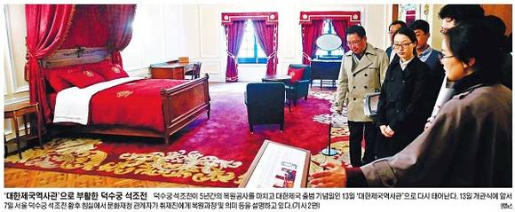 서울신문은 7일 문화재청이 언론에 처음 공개한 덕수궁 석조전 중양홀의 사진을 실으며 “100년 전 그대로”라고 평했다. 세계일보도 덕수궁 석조전의 황후 침실에서 취재진에게 복원과정과 의미를 설명하는 관계자의 사진을 1면으로 전했다.