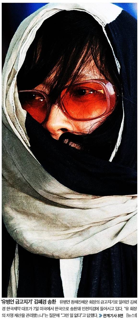 유병언 전 세모그룹 회장 최측근 김혜경 한국제약 대표가 7일 송환됐다. 검찰이 230억원대 횡령 및 배임 혐의를 받고 있는 김씨의 신병을 확보하면서 유씨 차명재산이 추가로 드러날지 관심이 모아지는 가운데 이날 중앙일보는 송환된 김혜경씨의 사진을 1면에 실었다. 중앙일보는 “김씨는 ‘유 회장의 차명 재산을 관리했느냐’는 질문에 ‘그런 일 없다’고 답했다”고 보도했다.