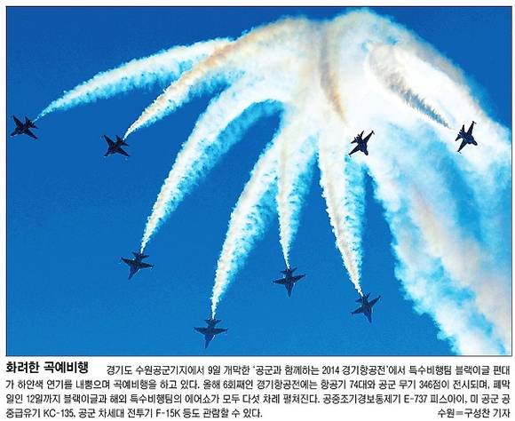 ‘공군과 함께하는 2014 경기항공전’이 경기도 수원공군기지에서 9일 개막했다. 올해 6회째인 경기항공전에는 항공기 74대와 공군 무기 346점이 전시되며, 폐막일인 12일까지 블랙이글과 해외 특수비행팀의 에어쇼가 모두 다섯 차례 펼쳐진다.