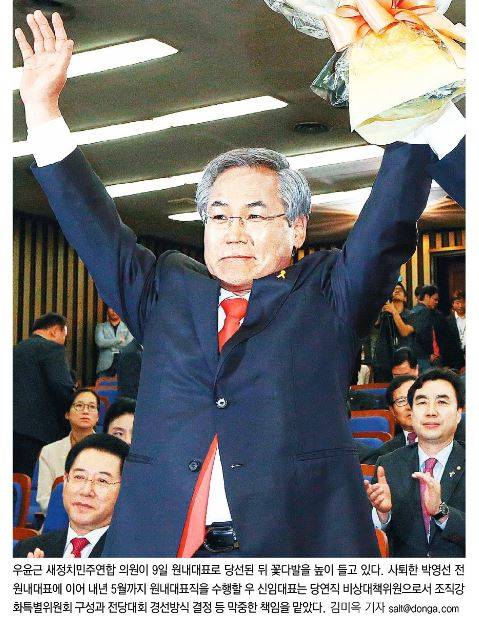 동아일보는 우 의원이 원내대표로 당선된 뒤 꽃다발을 높이 들고 있는 모습을 전하며 “사퇴한 박영선 전 원내대표에 이어 내년 5월까지 원내대표직을 수행할 우 신임대표는 당연직 비상대책위원으로서 조직강화특별위원회 구성과 전당대회 경선방식 결정 등 막중한 책임을 맡았다”고 보도했다.