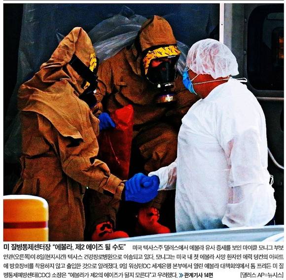 중앙일보는 이날 에릭 덩컨의 아파트에 방호장비를 착용하지 않고 출입한 마이클 모니그 부보안관이 에볼라 유사 증세를 보여 텍사스 건강장로병원으로 이송되는 모습을 1면 사진으로 전했다. 중앙일보는 “9일 워싱턴DC 세계은행 본부에서 열린 에볼라 대책회의에서 톰 프리든 미 질병통제예방센터(CDC) 소장은 ‘에볼라가 제2의 에이즈가 될지 모른다’고 우려했다”고 보도했다.