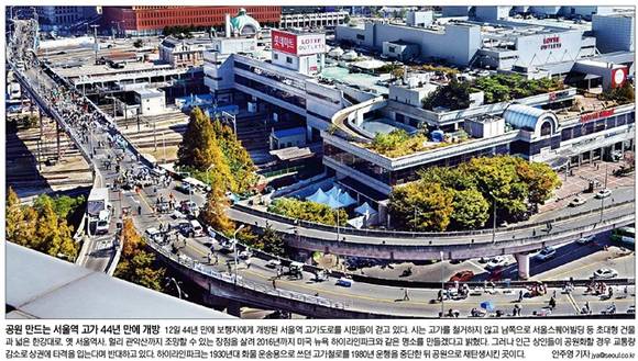 서울역 고가도로가 지난 12일 44년만에 보행자에게 개방됐다. 서울시는 미국 뉴욕의 하이라인파크를 모델로 시민들이 서울시내를 조망할 수 있는 명소를 만들겠다는 계획을 밝혔지만, 인근 상인들은 상권에 타격을 받을 것이라며 반대하고 있다.