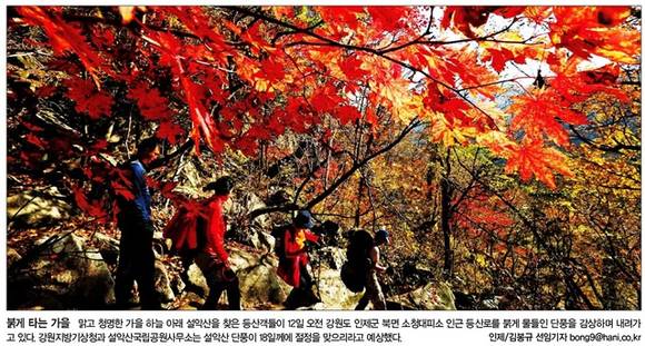 10월의 두 번째 주말이 지난 가운데, 국민일보와 한겨레신문은 단풍으로 물든 산을 1면에 실었다. 국민은 강원도 평창군 오대산의 한 계곡에서 관광객들이 단풍을 감상하는 모습을 보도하며 “기상청은 올해 일조량이 풍부하고 일교차가 커 어느 해보다 단풍이 곱다고 예보했었다”고 전했다. 한겨레는 강원도 인제군 설악산의 등산로 사진을 싣고 “강원지방기상청과 설악산국립공원사무소는 설악산 단풍이 18일께에 절정을 맞으리라고 예상했다”고 밝혔다.
