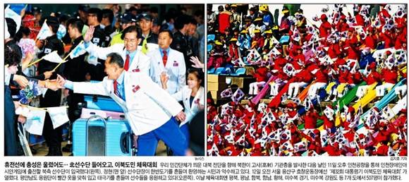 조선일보와 세계일보는 지난 10일 우리 민간단체가 띄운 대북 전단을 향해 북한이 기관총을 발사한 이후의 남북관계를 드러내는 상반된 사진을 실어 눈길을 끌었다. 조선은 ‘휴전선에 총성은 울렸어도… 北선수단 들어오고, 이북도민 체육대회’라는 제목의 1면 사진을 통해 11일 오후 인천장애인아시안게임에 출전할 북측 선수단이 인천공항에 입국하는 모습을 전했다.