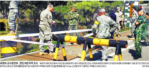 반면 세계는 “북한의 대북 전단 총격 사건으로 남북관계가 냉각 국면을 맞고 있는 가운데 유엔군사령부 군사정전위원회 관계자들이 11일 경기도 연천군 중면사무소와 인근 군부대를 방문해 지난 10일 북측 지역에서 대북 전단을 행해 발사된 14.5mm 고사총 탄두가 떨어진 지역을 조사하고 있다”고 보도했다.