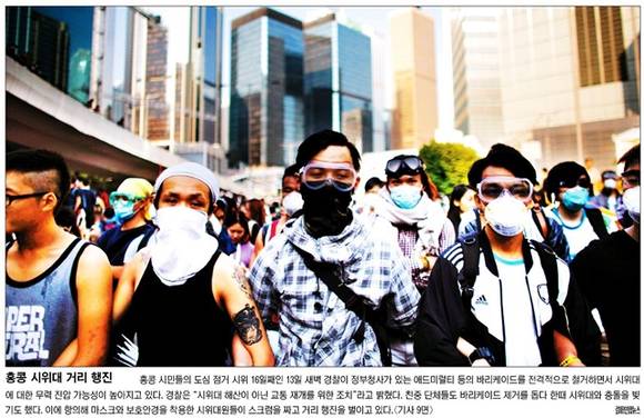 홍콩 시민의 도심 점거 시위가 16일째를 맞은 가운데 경찰이 일부 지역의 바리케이드를 철거하면서 ‘강제 진압 초읽기’에 들어갔다는 분석이 나왔다고 국민일보가 보도했다. 국민은 ‘홍콩 시위대 거리 행진’이라는 1면 사진에서 “13일 새벽 경찰이 정부청사가 있는 애드미럴티 등의 바리케이드를 전격적으로 철거하면서 시위대에 대한 무력 진압 가능성이 높아지고 있다”며 “경찰은 ‘시위대 해산이 아닌 교통 재개를 위한 조치’라고 밝혔다”고 보도했다.
