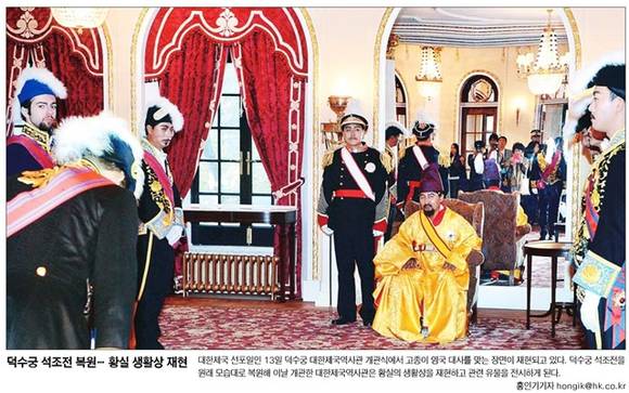 지난 13일 복원된 덕수궁 석조전이 개관했다. 한국일보는 1면 사진 ‘덕수궁 석조전 복원… 황실 생활상 재현’에서 “대한제국 선포일인 13일 덕수궁 대한제국역사관 개관식에서 고종이 영국 대사를 맞는 장면이 재현되고 있다”며 “덕수궁 석조전을 원래 모습대로 복원해 이날 개관한 대한제국역사관은 황실의 생활상을 재현하고 관련 유물을 전시하게 된다”고 전했다.