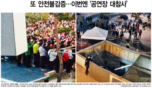 이날 조간신문들의 1면 제목도 사고의 심각성을 반영했다. ‘환풍구 아래로 또 무너진 안전’(경향), ‘또 안전 불감… 축제가 참사로’(국민), ‘또 ‘安全’이 추락했다’(조선), ‘또 무너진 안전’(서울), ‘또 안전불감… 어이없는 참사’(세계), ‘또 무너진 安全… 걸그룹 공연장 16명 사망’(조선), ‘걸그룹 공연 보던 16명 추락 사망’(중앙), ‘또 안전불감증… 이번엔 ‘공연장 대참사’’(한겨레), ‘비명 덮치다… 걸그룹 공연장 참사’(한국) 등이었다.