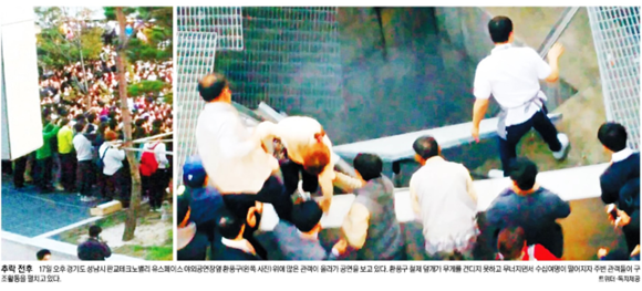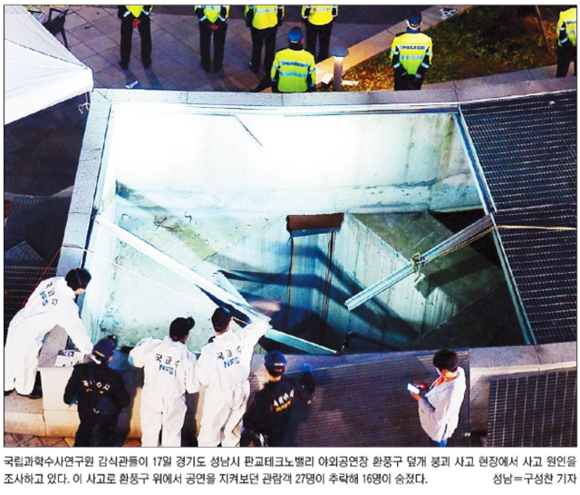 17일 오후 경기 성남 판교테크노밸리 야외공연장에서 관람객 무게를 견디지 못한 환풍구 덮개가 붕괴되며 27명이 20m 아래로 추락, 16명이 숨지고 11명이 다쳤다. 18일 모든 조간신문은 이 소식을 주요하게 다루며 1면 사진으로 실었다. 언론은 세월호 참사 발생 6개월 만에 또 다시 안전불감증 인재가 발생했다며 비판 수위를 높였다.