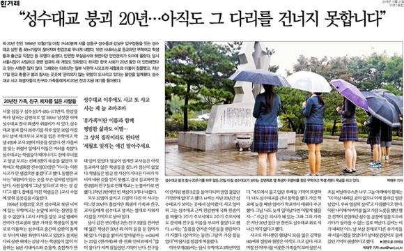21일은 1994년 성수대교 붕괴 참사 20주기이기도 하다. 한겨레는 20주기를 하루 앞둔 20일 아침 성수대교가 보이는 강변북로 옆 희생자 위령비를 찾은 무학여고 학생 4명의 묵념 모습을 실었다. 사진과 함께 ‘“성수대교 붕괴 20년…아직도 그 다리를 건너지 못합니다”’라는 1면 톱기사로 20년전 가족, 친구, 제자를 잃은 사람들을 조명하고 20년이 지난 지금도 환풍구 추락 사고 등에서 볼 수 있는 ‘관리되지 않는 위험’이 도사리고 있다고 지적했다.