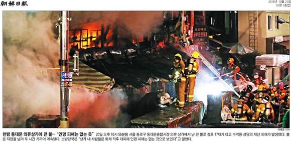 성남 판교 환풍구 추락 사고의 충격이 채 가시기도 전에 동대문시장 인근 원단상가에서 화재가 나며 시민들은 가슴을 쓸어내렸다. 21일 조간신문들은 전날 밤 10시56분쯤 서울 종로5가 동대문 평화시장 건너편 3층짜리 원단 상가건물 2층의 한 점포에서 큰 불이 난 모습을 1면에 보도했다. 다행히 인명피해는 없었다.