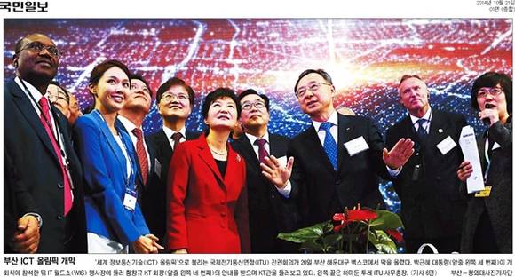 부산 벡스코에서는 ‘세계정보통신기술(ICT) 올림픽’으로 불리는 ‘2014 국제전기통신연합(ITU) 전권회의’가 20일 열렸다. 국민일보, 동아일보, 중앙일보, 세계일보는 1면에 박 대통령이 회의에 참석해 개막식 후 ‘월드IT쇼(WIS)’ 행사장을 찾아 KT관을 둘러보고 있는 모습을 보도했다.