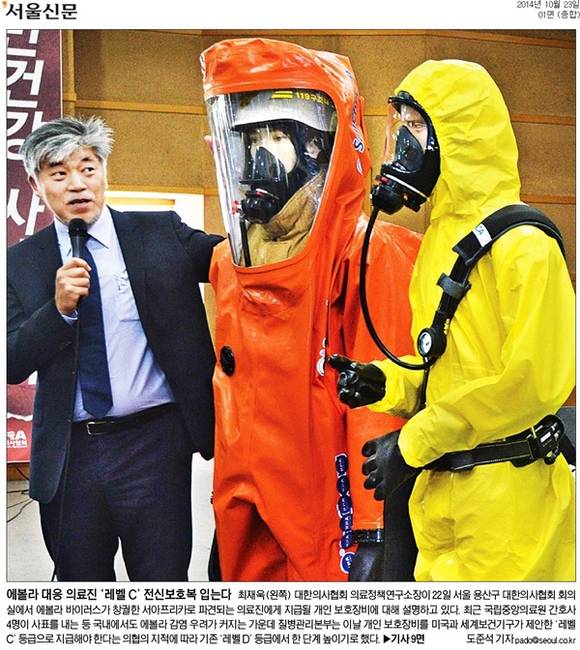 서울신문은 에볼라 바이러스가 창궐한 서아프리카로 파견되는 의료진에게 지급될 ‘레벨C’ 전신보호복을 소개했다. 서울신문은 “최근 국립중앙의료원 간호사 4명이 사표를 내는 등 국내에서도 에볼라 감염 우려가 커지는 가운데 질병관리본부는 22일 개인 보호장비를 미국과 세계보건기구가 제안한 ‘레벨C’ 등급으로 지급해야 한다는 의협의 지적에 따라 기존 ‘레벨D’ 등급에서 한 단계 높이기로 했다”고 밝혔다.