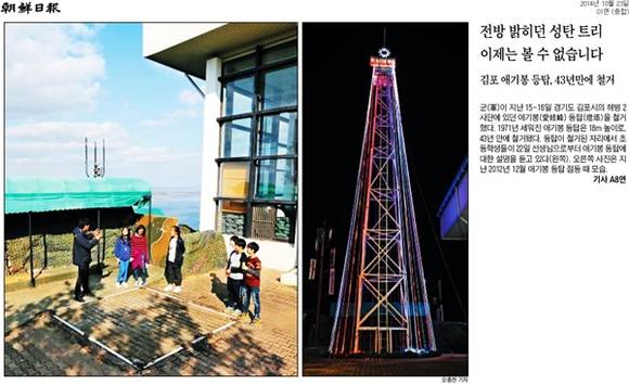 조선일보는 1971년 세워진 김포 애기봉 등탑이 43년 만에 철거됐다고 밝혔다. 조선일보는 ‘전방 밝히던 성탄 트리 이제는 볼 수 없습니다’ 제목의 사진에서 “군이 지난 15~16일 경기도 김포시의 해병 2사단에 있던 애기봉 등탑을 철거했다”며 “등탑이 철거된 자리에서 초등학생들이 22일 선생님으로부터 애기봉 등탑에 대한 설명을 듣고 있다”고 밝혔다.