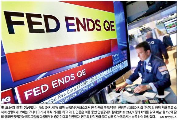 미국 연방준비제도이사회(연준)가 양적완화 종료를 선언했다. 미 연준은 이틀 동안 연방공개시장위원회(FOMC) 정례회의를 갖고 29일(현지시각) 월 150억 달러 규모인 양적완화 프로그램을 다음 달부터 중단한다고 밝혔다. 연준의 양적완화 종료 발표 후 뉴욕증시는 소폭 하락 마감했다. 서울신문은 ‘美 초유의 실험 성공했나’라는 제목으로 미국 뉴욕증권거래소에서 한 직원이 연준의 양적완화 종료 소식이 선명하게 보이는 모니터 아래서 주식 거래를 하는 사진을 1면에 게재했다.
