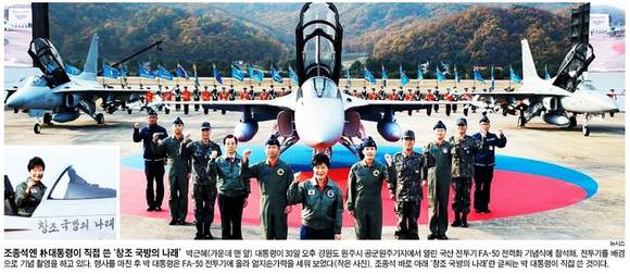 31일 경향신문, 국민일보, 조선일보는 박 대통령이 이날 기념식에 참석해 FA-50 전투기를 배경으로 기념촬영을 하는 모습을 1면 사진으로 보도했다. 행사를 마친 후 박 대통령은 FA-50 전투기에 올라 엄지손가락을 세워 보였다. 조종석 바로 아래 쓰인 ‘창조 국방의 나래’라는 글씨는 박 대통령이 직접 쓴 것이라고 조선일보는 전했다.