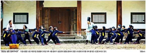 깊어가는 가을, 한겨레는 흐뭇한 미소를 자아내는 풍경 한 폭을 담았다. 가을소풍을 나온 어린이집 원생들이 30일 오후 서울 종로구 성균관대 명륜당 뜰에서 편을 나눠 줄다리기를 하며 즐거운 시간을 보내는 사진이다.
