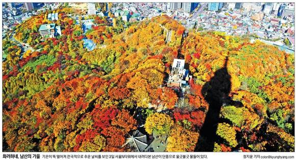 경향신문은 4일 '화려하네, 남산의 가을'이란 1면 사진으로 점점 멀어져 가는 가을 정취를 담았다.