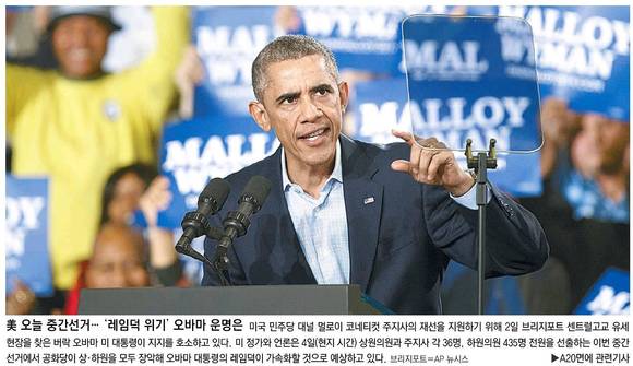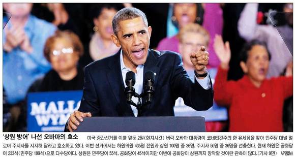 국민일보는 미국 중간선거를 이틀 앞둔 2일(현지 시각) 버락 오바마 대통령이 코네티컷주의 한 유세장을 찾아 민주당 대널 멀로이 주지사를 지지해 달라고 호소하는 장면을 1면 사진으로 게재했다.