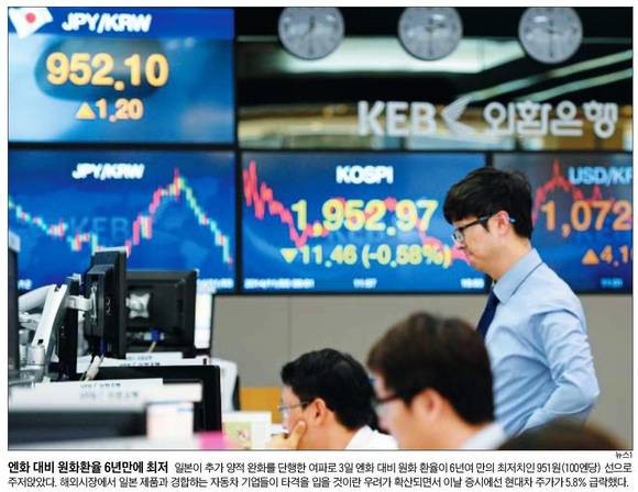 서울신문과 조선일보는 각각 '엔低 덮친 외환시장'과 '엔화 대비 원화환율 6년만에 최저'란 1면 사진기사를 통해 일본의 추가 돈풀기로 외환시장이 크게 출렁이는 소식을 보도했다.