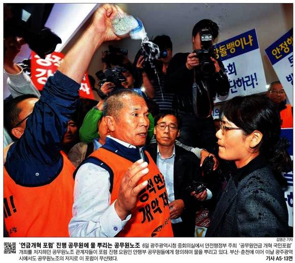 조선일보는 ''연금개혁포럼'진행 공무원에 물 뿌리는 공무원 노조'란 1면 사진을 통해 지난 6일 광주광역시청 중회의실에서 안전행정부 주최 '공무원 연금 개혁 국민포럼'개최를 저지하던 공무원 노조 관계자들이 포럼 진행 요원인 안행부 공무원들에게 항의하며 물을 뿌리고 있는 장면을 게재했다.