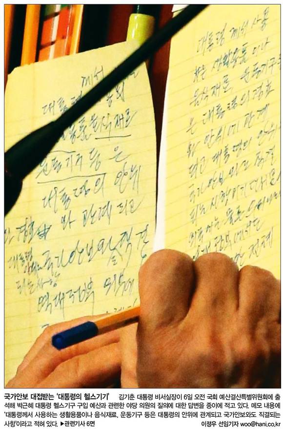 한겨레는 '국가안보 대접받는 '대통령의 헬스기기''를 통해 김기춘 대통령 비서실장이 6일 오전 국회 예산결산특별위원회에 출석해 박근혜 대통령 헬스기구 구입 예산과 관련한 야당 의원의 질의에 대한 답변을 종이에 적고 있는 장면을 싣었다.