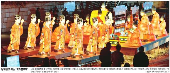 한국일보는 '청계천 밝히는 '빛초롱축제''란 1면 사진을 통해 7일부터 시작되는 '서울 빛초롱축제'소식을 전했다.