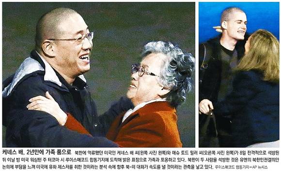 경향신문, 국민일보, 한국일보도 ‘가족 품으로’라는 제목을 통해 가족들과 재회의 기쁨을 나누는 케네스 배와 매튜 토드 밀러의 모습을 1면 사진으로 보도했다.