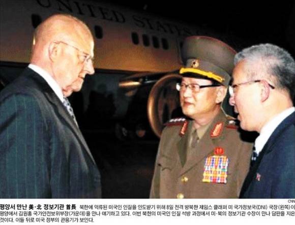 북한에 억류된 미국인 인질을 인도받기 위해 제임스 클래퍼 국가정보국장이 평양을 방문함에 따라 이를 관심 있게 지켜본 신문도 있었다. 조선일보는 ‘평양서 만난 美·北 정보기관 首長’이라는 제목의 1면 사진을 통해 제임스 클래퍼 국가정보국장과 김원홍 국가안전보위부장이 만나 얘기하는 모습을 전했다. 조선일보는 “이번 북한의 미국인 인질 석방 과정에서 미·북의 정보기관 수장이 만나 담판을 지었다”며 “이들 뒤로 미국 정부의 관용기가 보인다”고 보도했다.