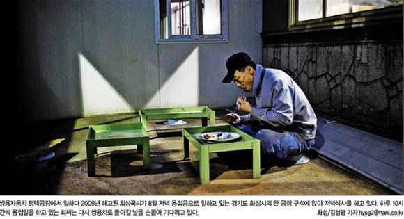 오는 11일 쌍용차 정리해고 사태가 2000일을 맞으면서 관련 기사와 사진을 1면으로 보도한 신문도 있었다. 한겨레는 쌍용자동차 평택공장에서 일하다 2009년 해고된 최성국씨의 사연을 소개하며 그와 관련된 사진을 1면에 실었다. 한겨레는 “최성국씨가 8일 저녁 용접공으로 일하고 있는 경기도 화성시의 한 공장 구석에 앉아 저녁식사를 하고 있다”며 “하루 10시간씩 용접일을 하고 있는 최씨는 다시 쌍용차로 돌아갈 날을 손꼽아 기다리고 있다”고 전했다.