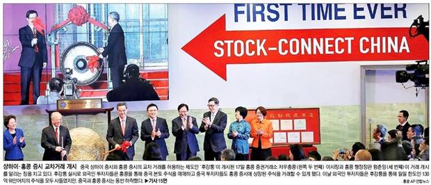 국민일보, 서울신문, 세계일보는 중국 상하이 증시와 홍콩 증시의 교차 거래를 허용하는 제도인 ‘후강퉁’이 개시됐다는 소식을 1면 사진을 통해 보도했다. 서울은 “후강퉁 실시로 외국인 투자자들은 홍콩을 통해 중국 본토 주식을 매매하고 중국 투자자들도 홍콩 증시에 상장된 주식을 거래할 수 있게 됐다”며 “이날 외국인 투자자들은 후강퉁을 통해 일일 한도인 130억 위안어치의 주식을 모두 사들였지만, 중국과 홍콩 증시는 동반 하락했다”고 전했다.