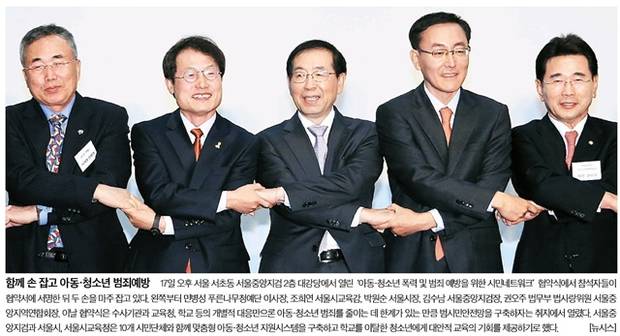 중앙일보는 지난 17일 서울 서초동 서울중앙지검에서 열린 ‘아동·청소년 폭력 및 범죄 예방을 위한 시민네트워크’ 협약식을 보도했다. 협약식에는 박원순 서울시장, 조희연 서울시교육감, 김수남 서울중앙지검장, 민병성 푸른나무청예단 이사장 등이 참석했다. 중앙은 “이날 협약식은 수사기관과 교육청, 학교 등의 개별적 대응만으론 아동·청소년 범죄를 줄이는 데 한계가 있는 만큼 범시민안전망을 구축하자는 취지에서 열렸다”고 전했다.