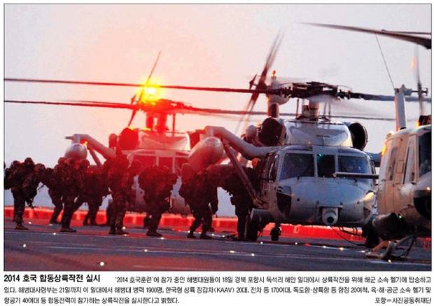 국민일보와 세계일보는 ‘2014 호국훈련’에 참가 중인 해병대원의 모습을 1면에 실었다. 국민은 지난 18일 경북 포항시 독석리 해안 일대에서 헬기에 탑승 중인 장면을 전하며 “해병대 사령부는 21일까지 이 일대에서 해병대 병력 1900명, 한국형 상륙 장갑차(KAAV) 20대, 전차 등 170여대, 독도함·상륙함 등 함정 20여척, 육·해·공군 소속 헬기 및 항공기 40여대 등 합동전력이 참가하는 상륙작전을 실시한다고 밝혔다”고 보도했다.