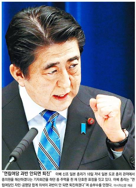 아베 일본 총리는 지난 18일 저녁 긴급 기자회견을 열고 경제 성장률 급감으로 위기에 몰린 상황을 타개하기 위해 중의원을 해산한다고 발표했다. 동아일보는 이날 기자회견 중 주먹을 쥔 채 단호한 표정을 짓고 있는 아베 총리의 모습을 1면 사진으로 보도했다. 동아는 “아베 총리는 ‘연립여당인 자민·공명당 합계 의석이 과반이 안 되면 퇴진하겠다’며 승부수를 던졌다”고 했다.