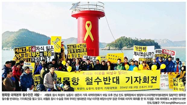 세월호 참사 희생자·실종자·생존자 가족 대책위원회가 18일 오후 진도 팽목항에서 범정부사고대책본부의 팽목항 철수를 반대하는 기자회견을 열었다. 한겨레신문은 이를 1면에 싣고 관련 기사를 통해 “대책위는 ‘가족들이 잠수사의 안전을 고려해 수중 수색의 중단을 받아들이자마자 정부가 범대본을 해체하겠다고 나서고 있다. 이는 마지막 한 사람까지 찾아주겠다고 했던 약속을 저버린 무책임한 태도’라고 지적했다”고 보도했다.