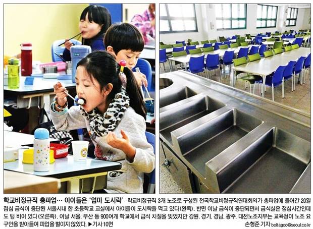 지난 20일 학교비정규직 3개 노조로 구성된 전국학교비정규직연대회의가 총파업에 들어가면서 서울, 부산 등 900여개 학교에서 급식 차질을 빚었다. 서울신문은 한 초등학교 교실에서 아이들이 도시락을 먹고 있는 사진과 텅 빈 급식실을 1면에 실었다.