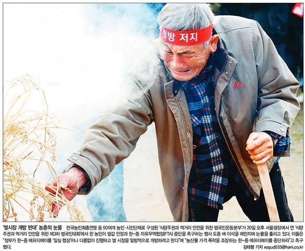 전국농민회총연맹 등 50여개 농민‧시민단체로 구성된 ‘식량주권과 먹거리 안전을 위한 범국민운동본부’가 20일 오후 서울광장에서 쌀값 안정과 한중 FTA 중단을 촉구하는 행사를 열었다. 한겨레신문은 한 농민이 행사 도중 벼 이삭을 만지며 눈물을 흘리는 모습을 1면에 싣고 “이들은 ‘정부가 한-중 에프티에이를 밀실 협상이나 다름없이 진행하고 쌀 시장을 일방적으로 개방하려고 한다’며 ‘농산물 가격 폭락을 조장하는 한-중 에프티에이를 중단하라’고 촉구했다”고 보도했다.