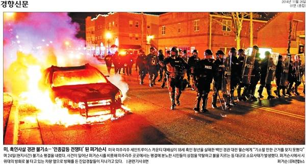 경향신문은 ‘‘인종갈등 전쟁터’ 된 퍼거슨시’ 제목의 사진에서 “미국 미주리주 세인트루이스 카운티 대배심이 18세 흑인 청년을 총으로 사살한 백인 경관 대런 윌슨에게 ‘기소할 만한 근거를 찾지 못했다’며 불기소 평결을 내렸다”며 “사건이 일어난 퍼거슨시를 비롯해 미주리주 곳곳에서는 평결에 분노한 시민들이 상점을 약탈하고 불을 지르는 등 대규모 소요사태가 발생했다”고 밝혔다.