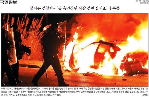 한국일보는 ‘美 퍼거슨시 전쟁터 방불’이라는 제목의 사진에서 “불기소 결정에 퍼거슨에서는 지난 8월처럼 거센 인종차별 항의시위가 재연될 조짐을 보이고 있다”고 밝혔다.