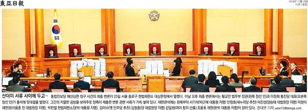 동아일보는 전날 서울 종로구 헌법재판소 대심판정에서 열린 통합진보당 해산심판 청구 사건 최종 변론 사진을 게재했다. 동아는 ‘산더미 서류 사이에 두고…’ 제목으로 “최종 변론에서 황교안 법무부 장관(왼쪽 점선 안)과 이정희 통진당 대표(오른쪽 점선 안)가 출석해 맞대결을 벌였다”며 “그간의 치열한 공방을 보여주듯 양측이 제출한 변론 관련 서류가 가득 쌓여 있다”고 밝혔다.