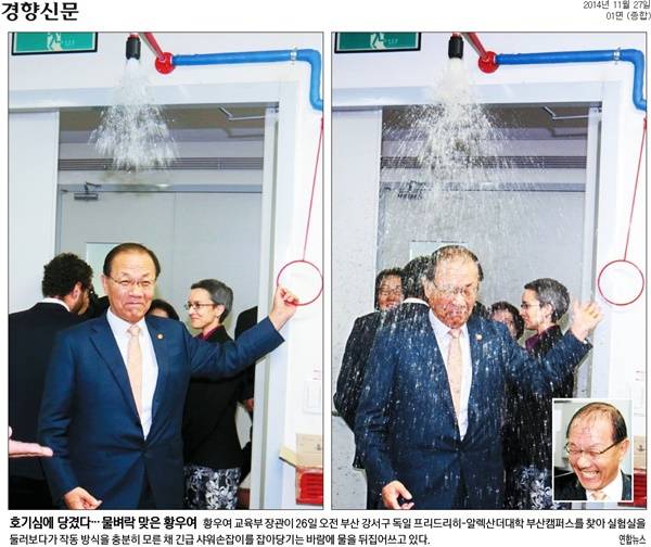 경향신문은 호기심에 물벼락 맞은 황우여 교육부 장관 모습을 실었다. 경향은 “황 장관이 26일 오전 부산 강서구 독일 프리드리히-알렉산더대학 부산캠퍼스를 찾아 실험실을 둘러보다가 작동 방식을 충분히 모른 채 긴급 샤워손잡이를 잡아당기는 바람에 물을 뒤집어쓰고 있다”고 밝혔다.