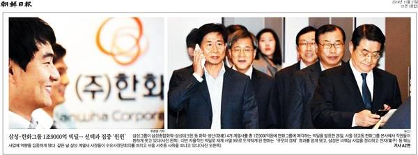 조선일보는 선택과 집중으로 ‘윈윈’전략을 택한 삼성과 한화그룹의 1조9000억원 빅딜을 전했다. 조선일보는 “삼성그룹이 삼성종합화학ㆍ삼성테크윈 등 화학ㆍ방산(防産) 4개 계열사를 총 1조9000억원에 한화그룹에 매각하는 빅딜을 발표한 26일, 서울 장교동 한화그룹 본사에서 직원들이 환하게 웃고 있다(사진 왼쪽)”며 “이번 자율적인 빅딜로 재계 서열 9위로 도약하게 된 한화는 ‘규모의 경제’ 효과를 얻게 됐고, 삼성은 비핵심 사업을 정리하고 전자(電子) 등 핵심 사업에 역량을 집중하게 됐다”고 밝혔다. 사진 오른쪽은 같은 날 삼성 계열사 사장들이 수요사장단회의를 마치고 서울 서초동 사옥을 떠나고 있는 모습.