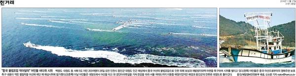 한겨레는 중국 불법조업 방지를 촉구하는 어민들의 바다 위 시위 사진을 보도했다. 한겨레는 “백령도ㆍ대청도 등 서해 5도 어민 200여명이 26일 오전 인천시 옹진군 대청도 인근 해상에서 중국 어선의 불법조업으로 인한 피해 보상과 재발방지대책 마련을 촉구하며 시위를 벌이고 있다”며 “어민들은 중국 어선으로부터의 영해주권 보호 촉구 내용이 적힌 펼침막을 어선에 매단 채 해상시위에 참가했다”고 밝혔다.