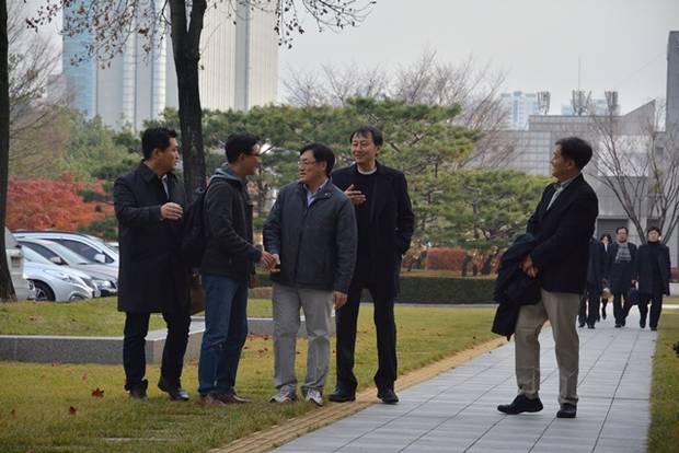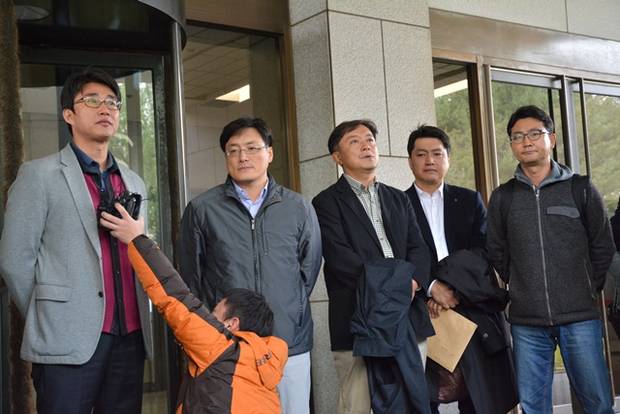 ▲대법원 판결 30여분을 앞두고 법정 앞에 모인 (왼쪽부터) 정유신, 현덕수, 조승호, 권석재, 우장균 기자. 이 때까지만 해도 이들은 대법원의 상식적 판단을 기대하며 웃음 띤 모습을 모였다.
