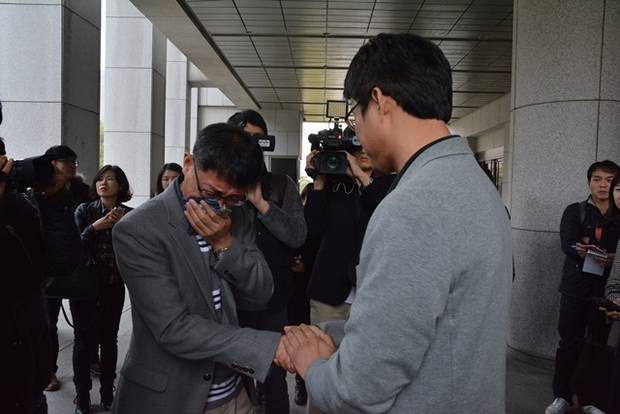 ▲판결 후 노종면 기자가 눈물 흘리는 김용수 YTN 전 노조 수석부위원장을 다독이고 있다.