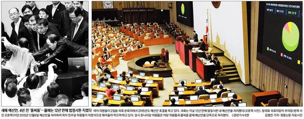 경향신문은 4년 전 몸싸움 속에 예산안이 처리되던 모습과 여야 의원들이 차분하게 자리에 앉아 예산안에 대해 찬반 버튼을 누르는 2014년 풍경을 대비시켰다. 경향에 따르면 2010년 12월8일에는 당시 한나라당 의원들이 야당 의원들과 몸싸움 끝에 예산안을 단독으로 처리했다.