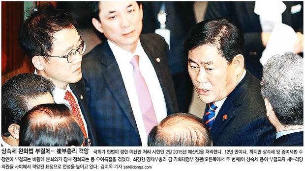 동아일보의 시선은 조금 달랐다. 동아는 예산안이 시한 내 처리되는 ‘훈훈한’ 풍경 대신 상속세 완화법 부결에 최경환 경제부총리가 격앙돼 있는 사진을 실었다. 동아는 “국회가 헌법이 정한 예산안 처리 시한인 2일 2015년 예산안을 처리했지만 상속세 및 증여세법 수정안이 부결되는 바람에 본회의가 잠시 정회되는 등 우여곡절을 겪었다”며 “최경환 경제부총리 겸 기획재정부 장관이 상속세 등이 부결되자 새누리당 의원들 사이에서 격앙된 표정으로 언성을 높이고 있다”고 설명했다.