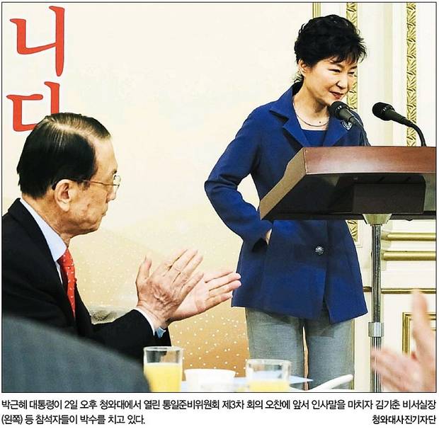 한겨레는 박근혜 대통령과 김기춘 비서실장 ‘투샷’을 1면에 실었다. “박 대통령이 2일 오후 청와대에서 열린 통일준비위원회 제3차 회의 오찬에 앞서 인사말을 마치자 김기춘 비서실장 등 참석자들이 박수를 치고 있다”는 설명과 함께.