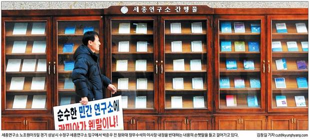 경향은 6일 청와대가 민간재단인 세종재단 이사장 선임에 두 차례 관여했다는 기록을 담은 재단 내부문건을 공개했다. 경향이 입수한 ‘세종재단 이사장 선임 경과보고’ 문건에 따르면 외교부는 지난 7월28일 공석인 재단 이사장에 박준우 전 청와대 정무수석을 내정해 통보한 것으로 확인됐다. 경향은 이 같은 내용의 1면 기사와 함께 세종연구소 노조원이 5일 경기 성남시 수정구 세종연구소 입구에서 박준우 전 수석의 이사장 내정을 반대하는 내용의 손팻말을 들고 걸어가고 있는 사진을 실었다.