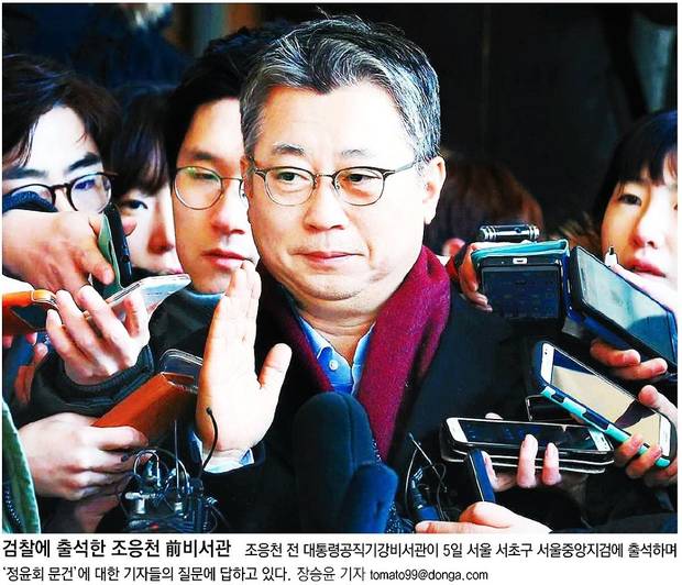4일 박관천 경정에 이어 5일 조응천 전 공직기강비서관이 검찰에 출두해 정윤회 씨 국정개입 의혹 동향 보고 문건 유출과 관련해 수사를 받았다. 6일 국민‧동아‧세계‧조선‧한국일보 등 주요 일간지들은 조 전 비서관이 취재진에 둘러싸인 채 서울중앙지검에 출두하는 모습을 1면 사진으로 보도했다.